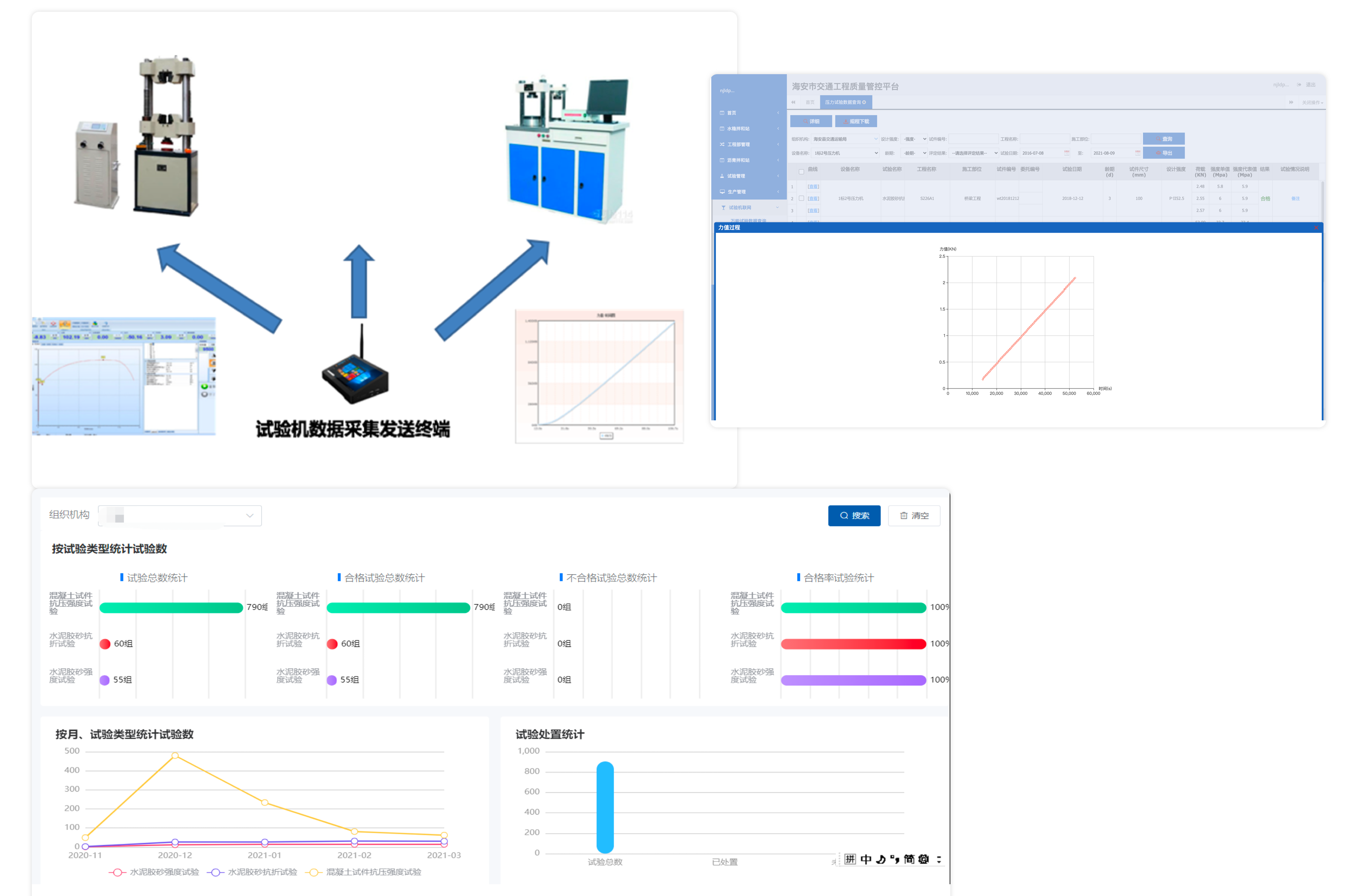 在試驗(yàn)機(jī)安裝智能數(shù)據(jù)采集終端,全自動(dòng)化采集試驗(yàn)機(jī)的試驗(yàn)數(shù)據(jù),按照規(guī)范要求進(jìn)行匯總、統(tǒng)計(jì)分析,管理人員可以及時(shí)的